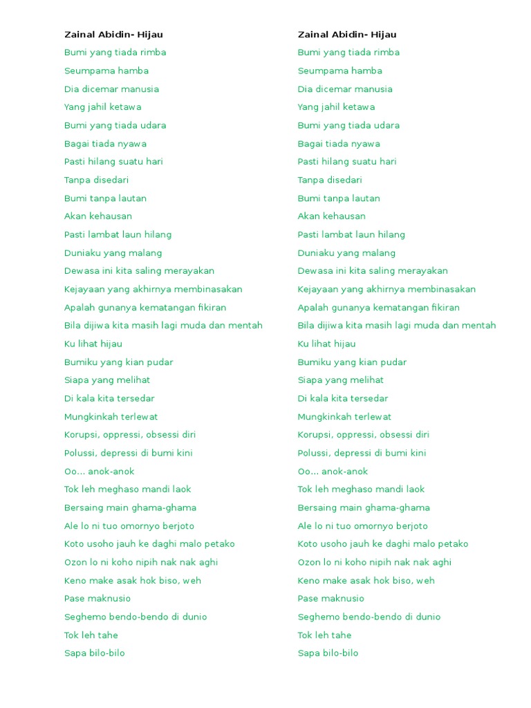 Listen to Hijau MP3 Song by Zainal Abidin from the Malay movie Zainal Abidin 1 free online on Gaana. Hijau English translation A A Green The earth with no forest Is like a slave It is polluted by humans Whos laughing ignorantly The earth with no air Is as it has no soul It will surely disappear one day Without being realized The earth without ocean Will be exhausted Soon they will surely disappear My hapless world. Feat Akim AhmadAltimetHazamaAdiraDina and FourteenAnugerah Bintang Popular Berita Harian 2013 ABPBH 2013.